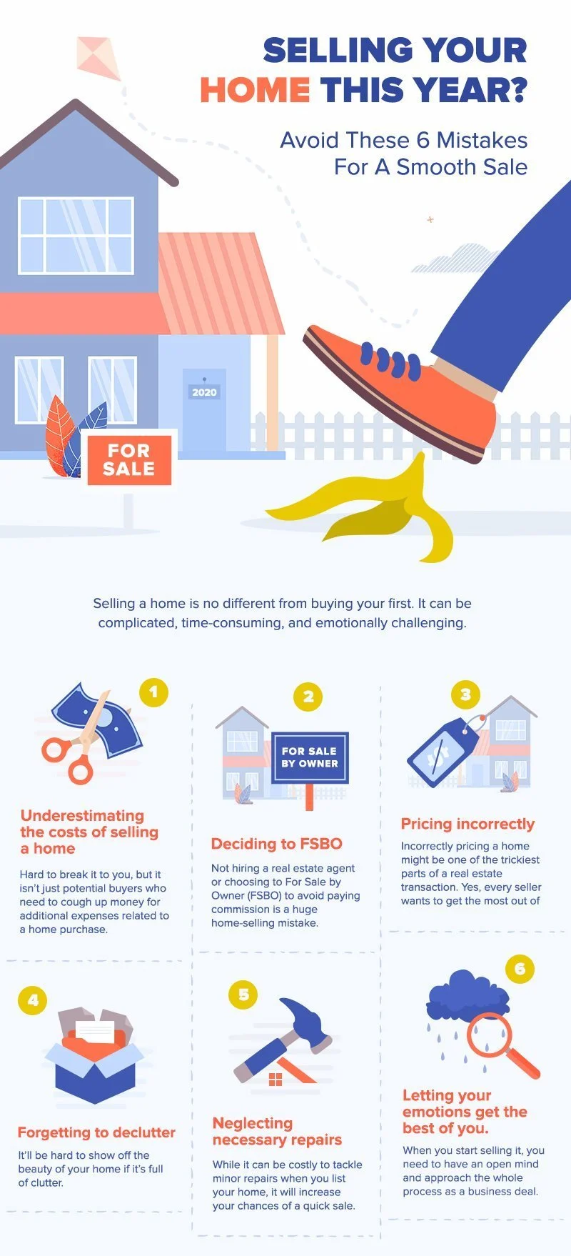 Not hiring a real estate agent or choosing to For Sale by Owner (FSBO) to avoid paying commission is a huge home-selling mistake. According to the National Association of Realtors' 2019 Profile of Home Buyers and Sellers, only eight percent of recent home sales were FSBO, which remains at an all-time low. FSBO homes sold at a median of $200,000, compared to the median of agent-assisted homes which is at $280,000. That’s a whopping $80,000 difference!